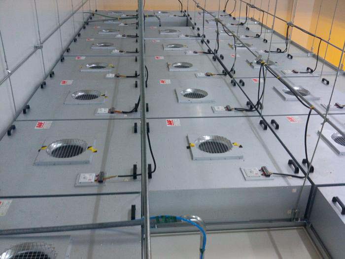 先將高效過濾器(進出風兩面已經貼橡膠密封條)穩固地放置在FFU頂棚龍骨上。